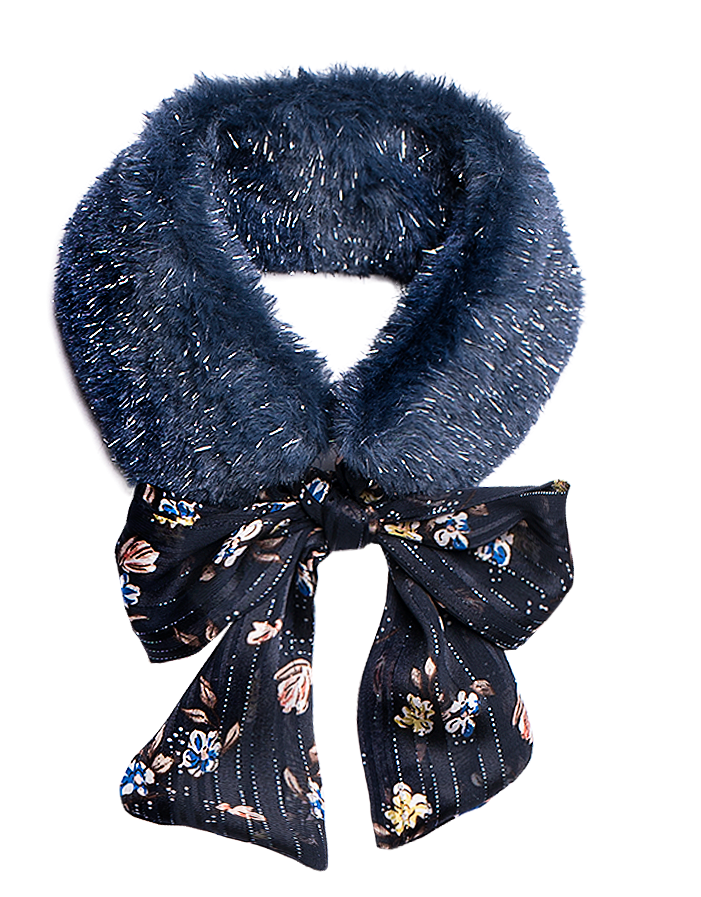 A plush faux fur scarf accented with a floral bow tie. Cozy, lightweight, and perfect for adding warmth and charm to fall and winter looks.